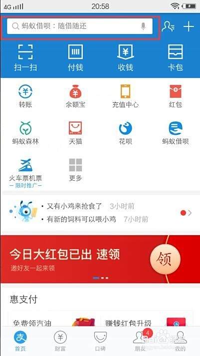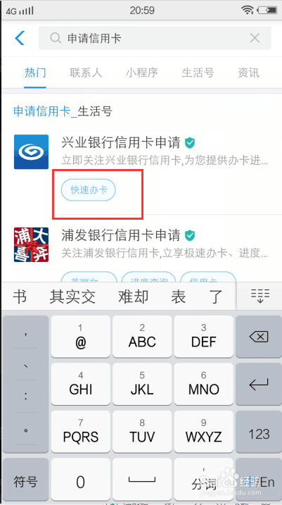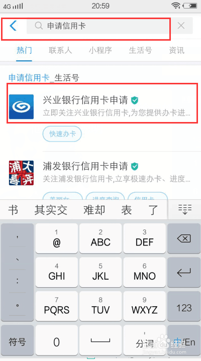 然后在支付宝搜索框中,搜索“申请信用卡”,如下图所示: