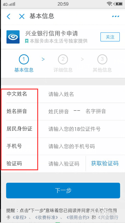 填写基本信息,比如名字,身份证号码,手机号码等等,再点击“下一步”按钮,如下图所示:
