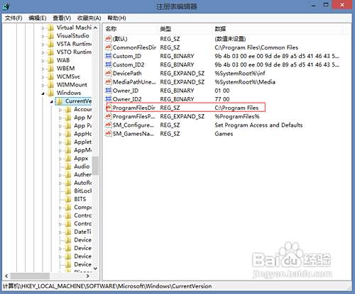 注册表定位到“[HKEY_LOCAL_MACHINE\SOFTWARE\Microsoft\Windows\CurrentVersion]”右侧找到“ProgramFilesDir”