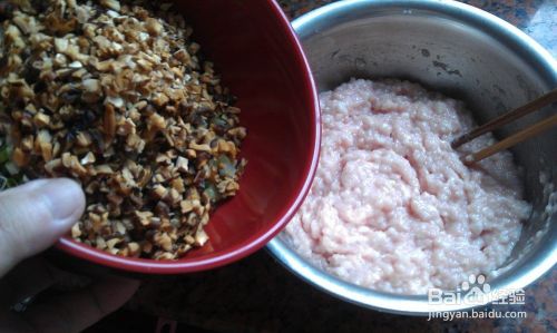 把切好的香菇,小葱,姜末一起放入肉泥中。