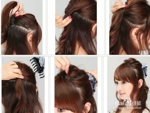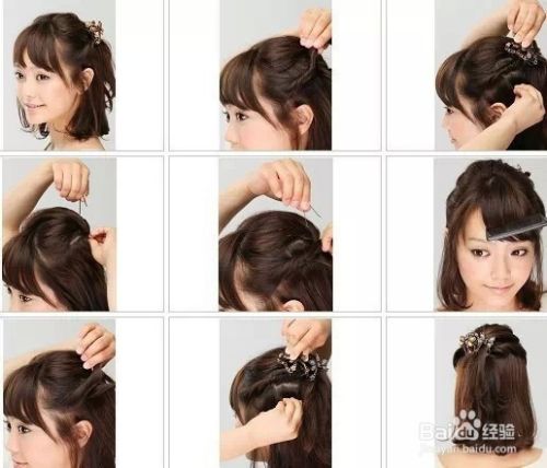 首先将上半区的头发抓起来,做拱。将两侧的头发拧转,然后用夹子固定在后面中部,交叉的固定,用夹子固定。然后用一个大发抓将所有的黑夹子掩盖,最后整理下刘海。