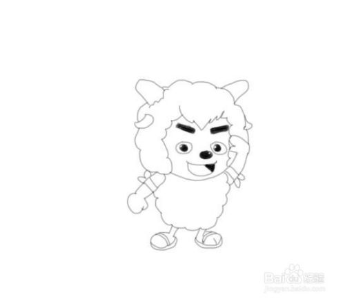 最后我们再在身体的下面再画出沸羊羊的两条腿,然后再在腿部的基础上再画出沸羊羊的两只脚,这样沸羊羊就画好了,如图所示: