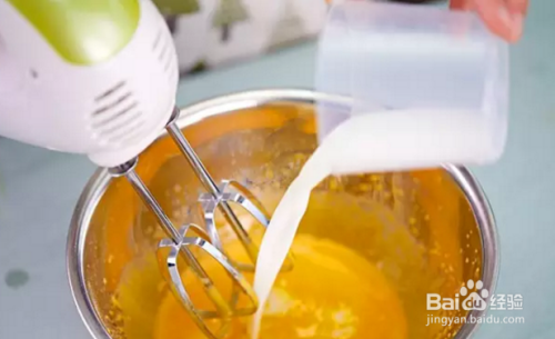 在蛋黄中加入10g糖粉,用打蛋器打发至体积蓬松、颜色变浅的浓稠状;