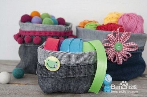 收纳袋:从牛仔裤的裤腿处剪适当大小,缝制成立方体或圆筒状,可以加点小装饰,纽扣啊丝带之类的。可以收纳一些小玩意,就不怕乱丢乱放找不到啦~