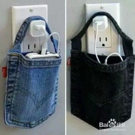 装手机的小袋子,方便充电:单独剪下牛仔裤的背面的口袋,再缝制条带子在上面,这样就可以把手机装里面,挂在插头上充电啦~即便插座离桌子太远,手机充电也不愁没处安放喽~