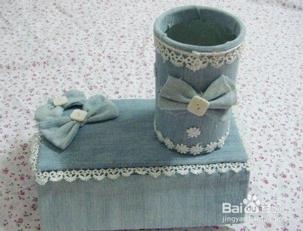 纸巾盒&笔筒:先用硬纸板制作一个简易纸巾盒或者笔筒,然后把牛仔布剪成适当大小,包裹在外层,用胶水粘起来,最后可用蕾丝布或小纽扣做点装饰,既环保又美观!