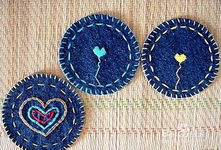 杯垫:可以用深色的牛仔裤剪成圆形状,复合2-3层,稍微增加厚度感,用你喜欢颜色的线把边缘处缝合起来,中间也可以自己绣点好看的图案喔~
