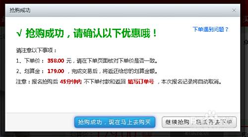 抢购成功后会提示你是否现在购买,如果现在不买,40分钟后就要重新抢购了