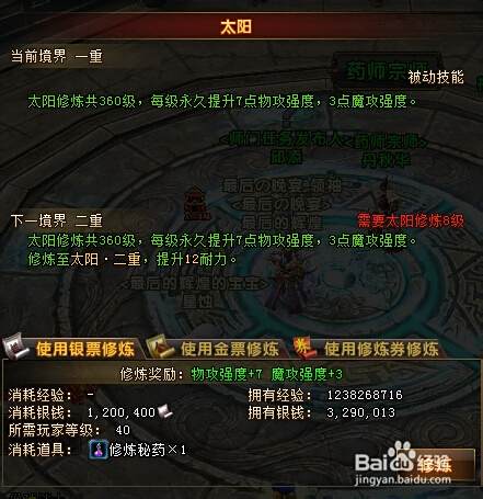 下图太阳 一级增加七点物攻强度+3点魔攻强度 境界提升增加耐力(血量+物防)
