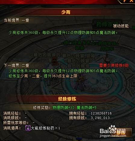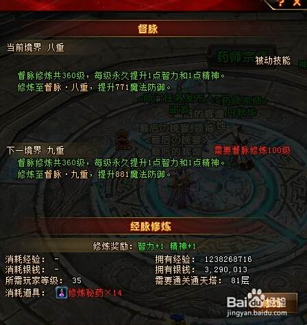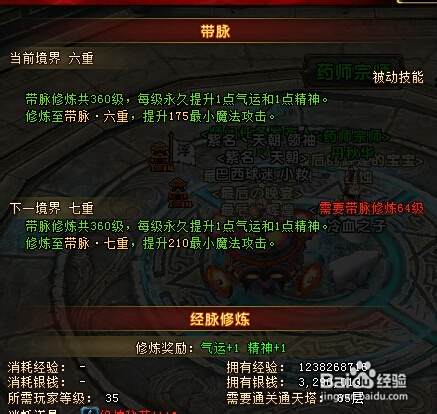 如下图 督脉 每升级一次增加一点精神和一点智力。每次境界提升增加魔法防御