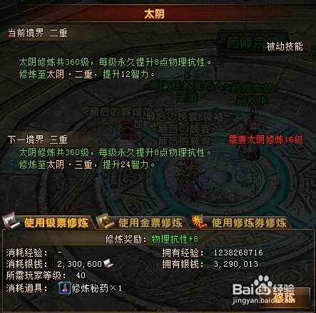 太阴 升级一次增加八点物理抗性。境界提升增加智力。
