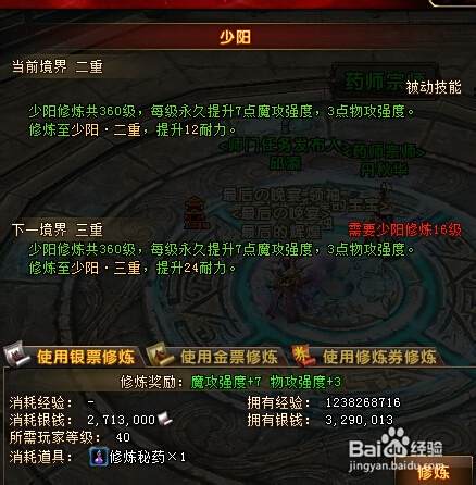 少阳 每次升级增加七点魔攻强度+三点物攻强度,境界提升额外增加耐力。如下图: