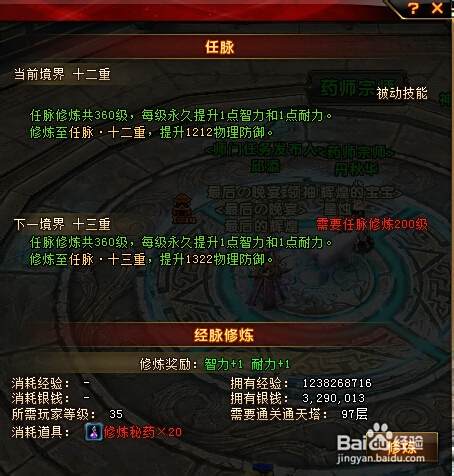 如下图 任脉 每升一级增加一点耐力和一点智力,每次境界提升额外增加物理防御。