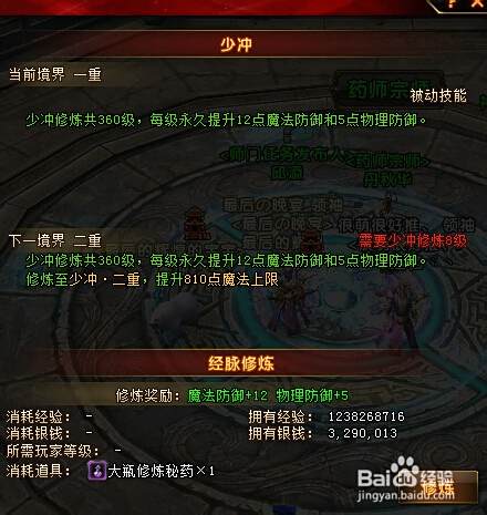 少冲 升级一次增加5点物防+12点魔防 境界提升增加魔法值。详见下图
