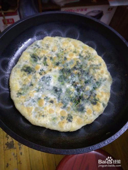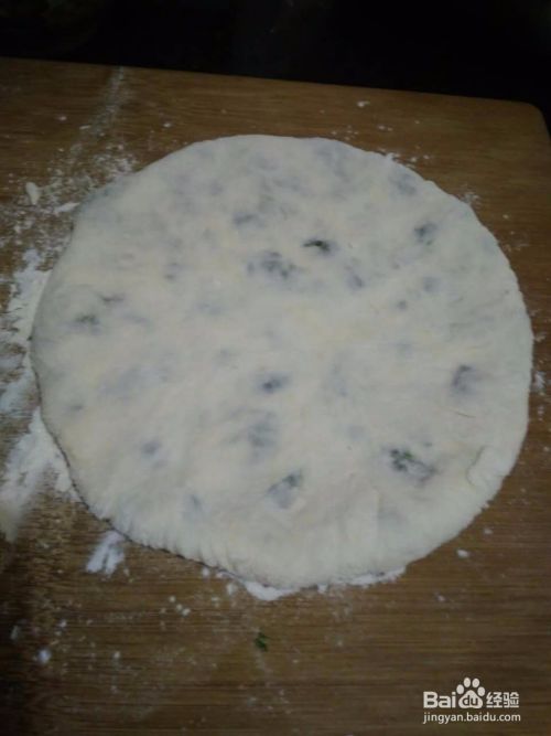 准备食材,将青菜叶子洗净切好,待用,面粉兑水糅合,加入适量苏打粉,将青菜叶子加盐,炒至半熟,包进去