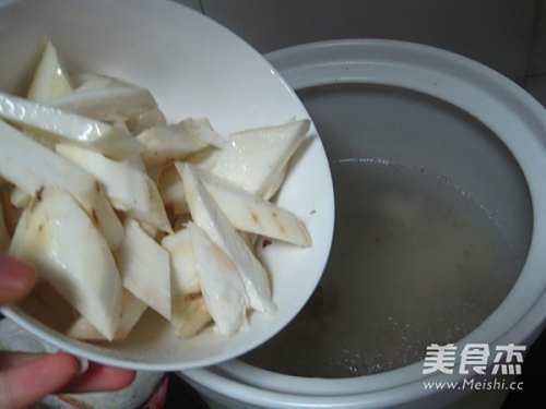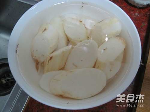 1淮山去皮后洗净切片,然后浸泡在清水中。