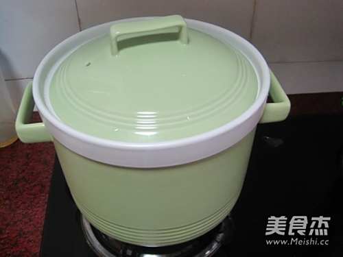 8加入洗净的百合,然后盖子盖子煮,大火煮开改小火煮至大米软透。