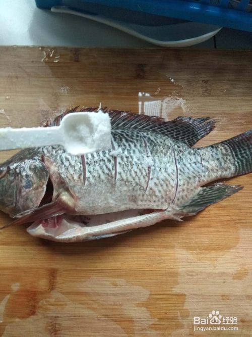 然后在用到在鱼上划横,两边都要划,这样鱼会更加的如味道。然后在鱼身上撒盐,涂抹均匀。腌制一下。
