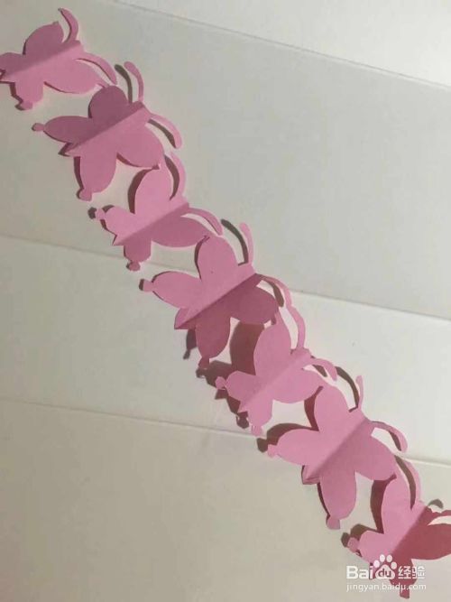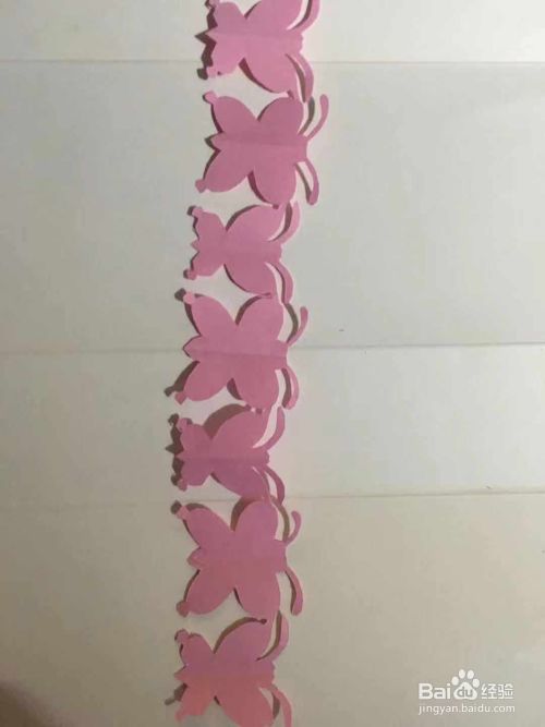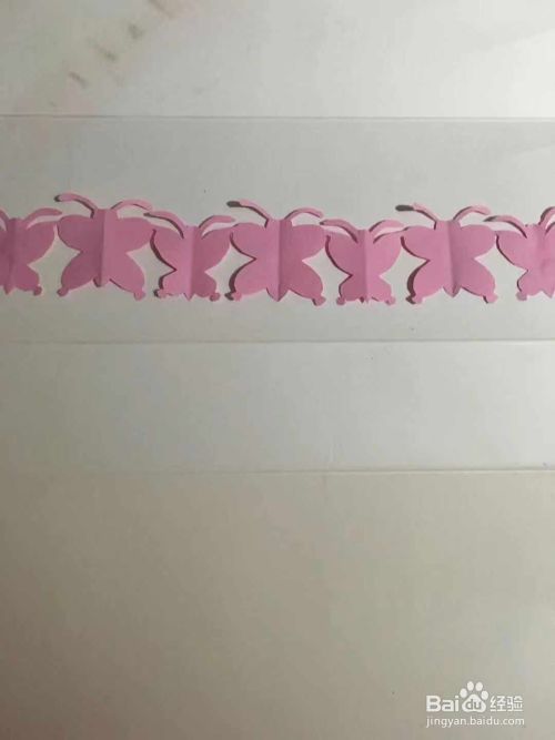 第六步 剪完了外围的彩纸之后 再剪出两只蝴蝶的触须 头部 翅膀和身子 还有其它涂实的部分 都剪好之后 展开铺平 一条漂亮美观的蝴蝶花边就裁剪完成了