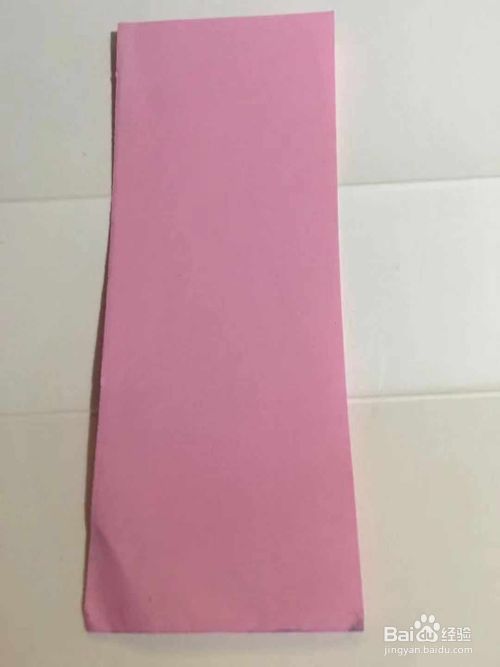 第一步 把一张长26厘米宽7厘米的长方形粉色彩纸竖起来摆放 然后从下向上对角折叠