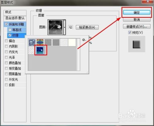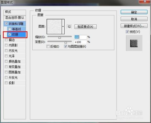 在【图层样式】里,选择【斜面和浮雕】下面的【纹理】打上【√】。