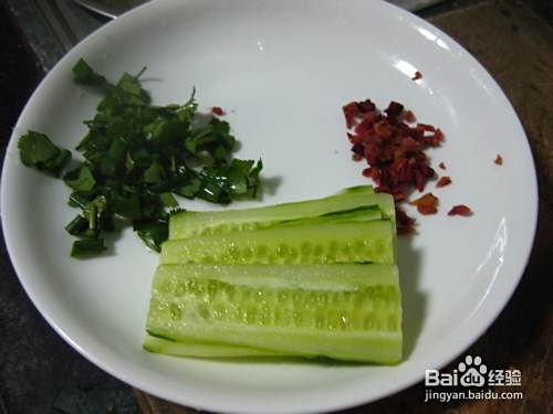咸菜切细,黄瓜切片。香菜和葱花切末