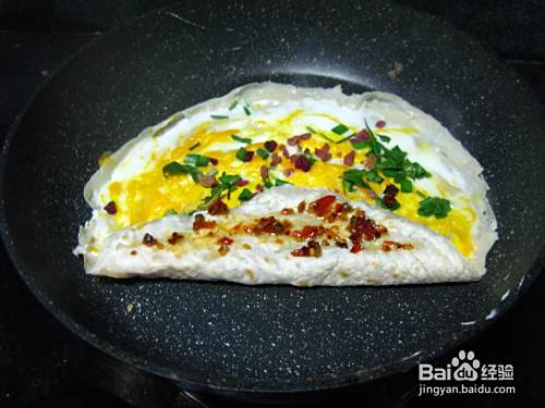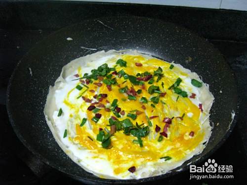 撒上咸菜末、葱花和香菜,小火煎一分钟,待鸡蛋凝固
