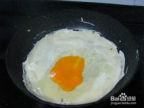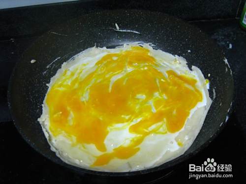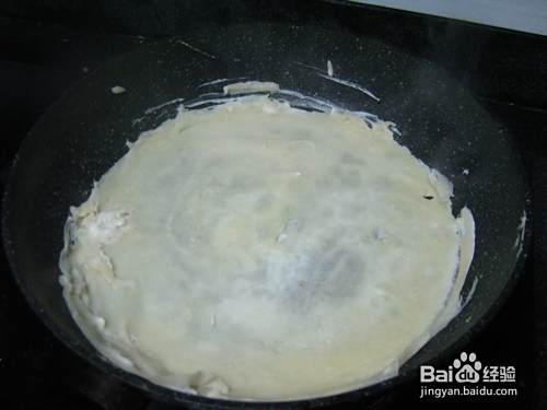 平底锅烧干水分,将面糊摊匀。可以用刮板刮匀