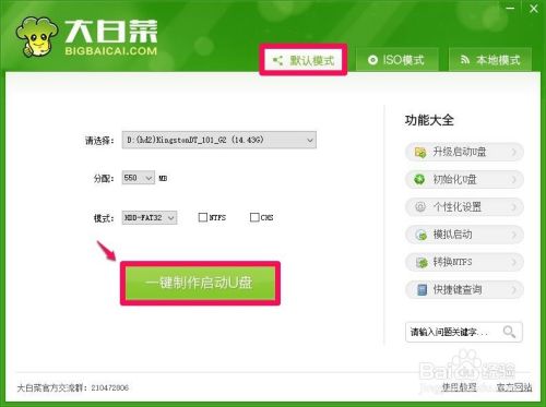 把准备好的U盘插入电脑,左键双击系统桌面上的【大白菜UEFI版】图标,在打开的大白菜窗口的【默认模式】下点击:一键制作启动U盘;