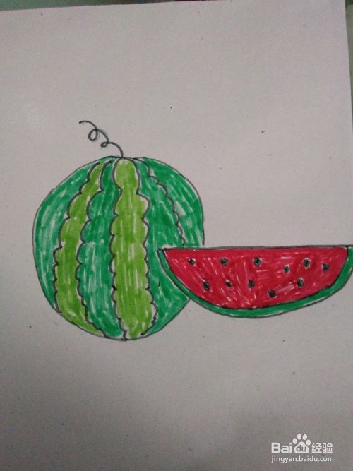 在半块西瓜的地方,画上几个小的椭圆形,作为西瓜的种子。