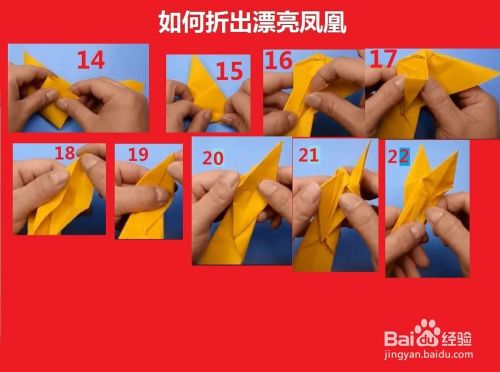 14将双三角形折成双正方形,15正方形开口边对折,16加深折痕,17将里面一层翻出来,18下角折向上面。19加深折印,20另一个双3角形同样折,21翅膀左右重合折叠,22翅膀下部向中间折叠。