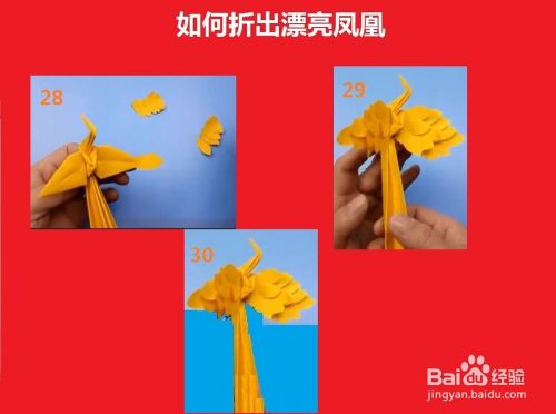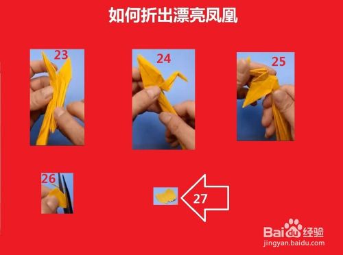 23下面尖角拉起,成凤凰头,24折出凤嘴,25尾部来回折。26另用一张小纸片来回折,剪成有花边的凤毛,27多剪些这种形状的凤毛。