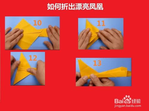 10翻面,11对顶角回折,12压平成双3角形,13下面翅膀向上折。