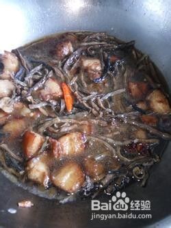 加入料酒,八角,辣椒壳,老抽,生抽,加入适量的水、盐,开大火煮开再转小火煮30分钟,
