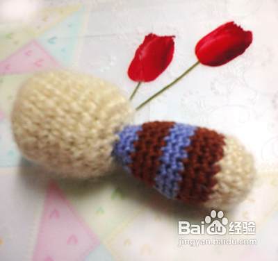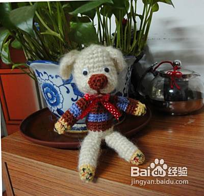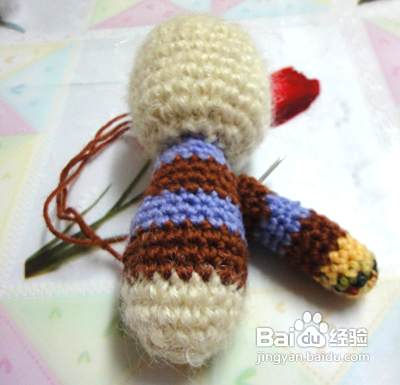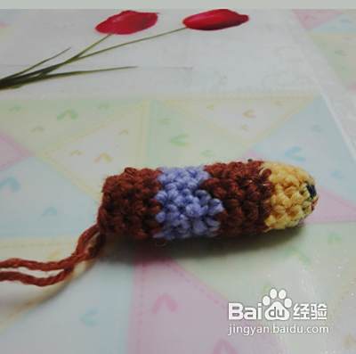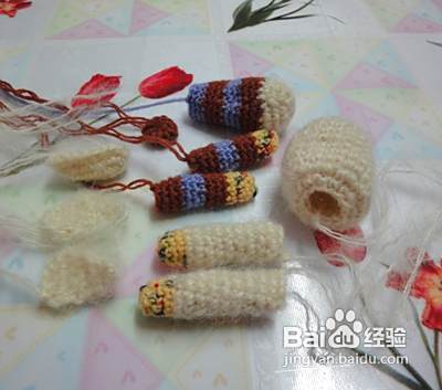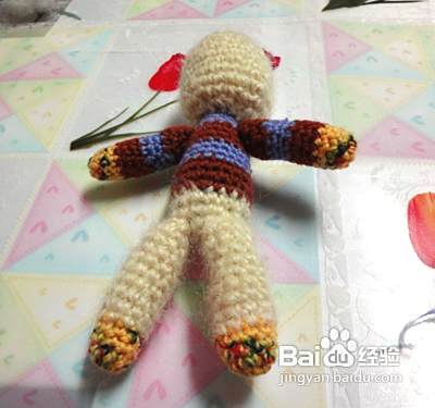 继续啦,我们再钩下肢起头用彩色线同上8针。第二行至第七行不加减针 第八行减一针。第九行至第十二行不加减针需要钩织2件 完成