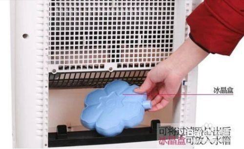 冰晶空调扇通过把冰晶盒放入冰箱冷冻室后放入水箱,使用时间2到3h,需准备多个冰晶盒交换使用。