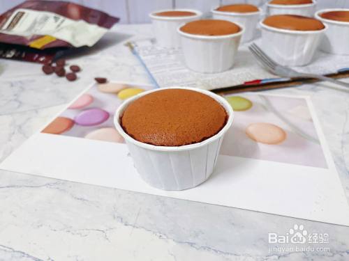 出炉轻震一下,脱模放凉。巧克力流心。 淡奶油加热冒泡,倒入黑巧克力中,融化黑巧克力并搅拌顺滑,装进裱花袋中。杯子蛋糕中间挖一个洞挤入巧克力流心。
