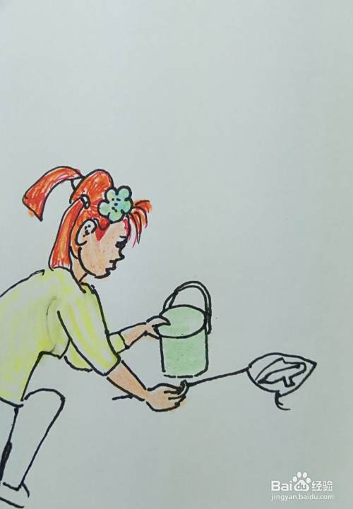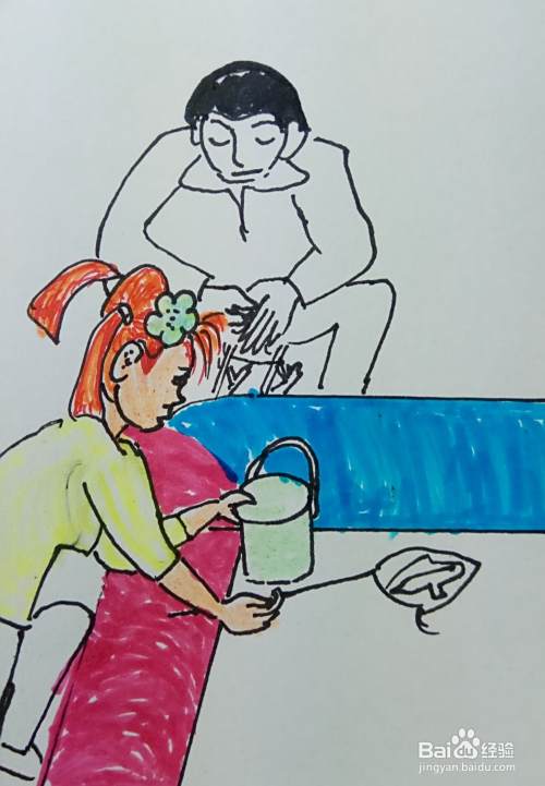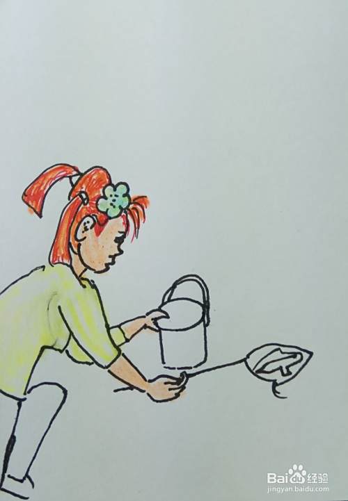 用水彩笔涂出她手里拿着的水桶色彩和她头上带着的发饰色彩。