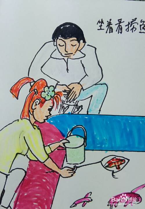 用线条和曲线画出一个人的身体轮廓,并画出他的五官和头发,他正在旁边坐着看这个女孩捞鱼呢,再画出水池的轮廓,并涂上色彩。修饰一下细节,简笔画就画好了。