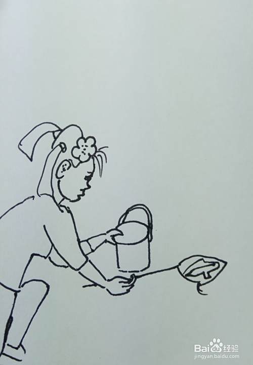 画出她的身体部分和她的胳膊,并画出她左手里拿着一个水桶。