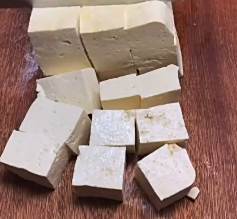 把豆腐切成大大的块儿,水开下锅烫一分钟,烫好捞出等着备用