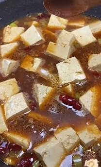 锅里烧油,下一勺黄豆酱,黄豆酱一定要多炒一会儿,放葱蒜,干辣椒,再放点生抽和蚝油,必须放点儿花椒面炝下锅,炒香以后加点儿水,放入焯好的豆腐,少放点盐和鸡精,小火扣上盖儿焖三分钟就行,最后撒点小葱花就可以出锅了。