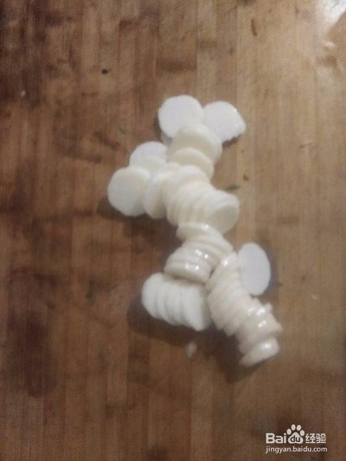 再将食盐切成圆片或棱形等形状,切好后,放入凉水中浸泡5分钟,去掉粘液。