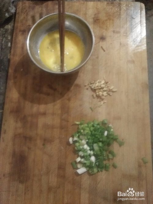 然后取来2个鲜鸡蛋,去掉蛋壳,用筷子搅匀,备用。再将香葱处理一下,洗净切成小段。
