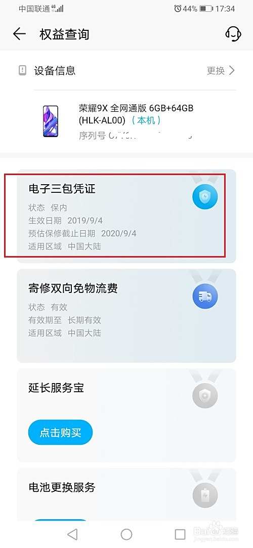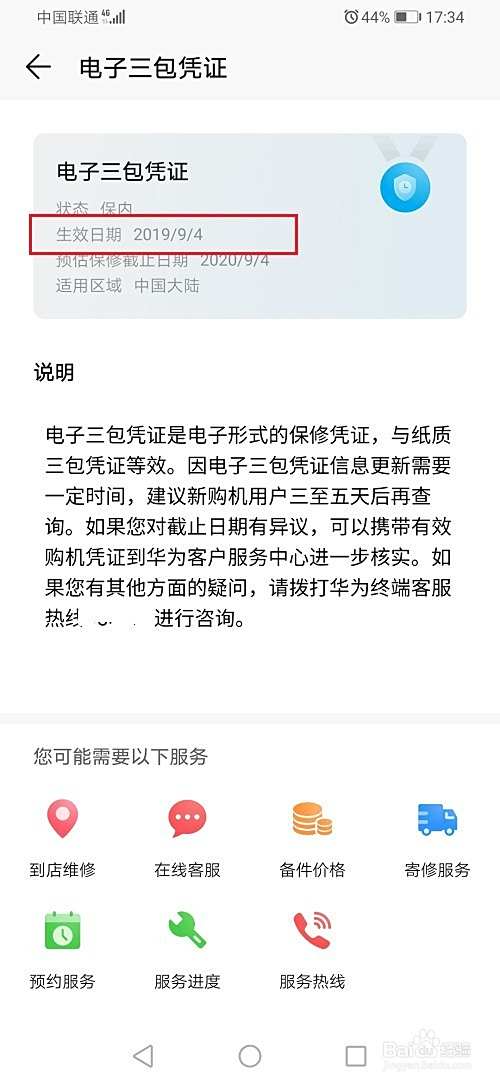 第五步进去华为荣耀手机电子三包凭证界面,我们可以看到生效日期,如果生效日期和我们打开手机的日期相近,那么就是新机,反之,就不是新机