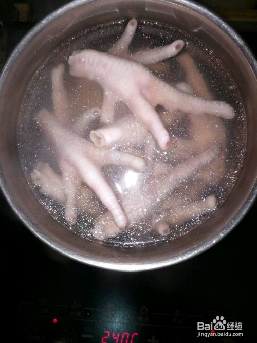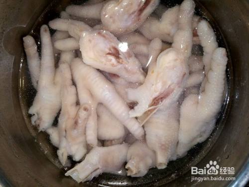 3姜切成片,与鸡爪放锅里煮,再放料酒,水煮沸后小火煮10-12分钟,鸡爪熟为止,但不能煮烂;
