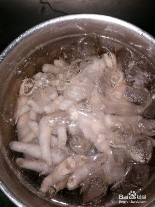 4过冷河,将热水倒走,放上冰和清水,浸泡15-30分钟,让鸡爪充分冷却;