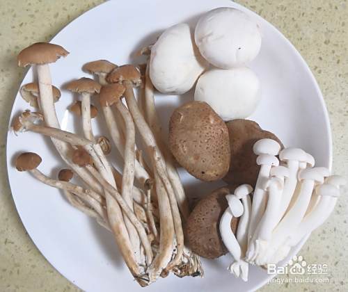 将选好的各种蘑菇去根洗净,茶树菇切成两段,口蘑和香菇切成片。