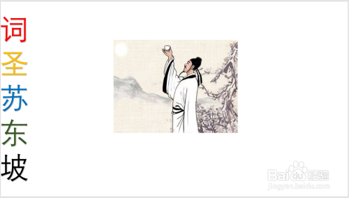 用不同颜色的画笔在画纸的左边,竖直方向写上标题——词圣苏东坡。