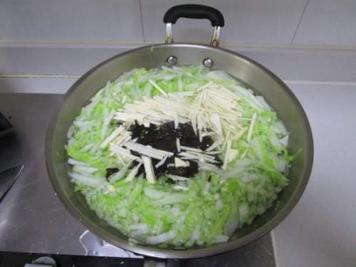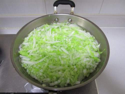 4先把白菜丝冷水下锅,盖上大火烧